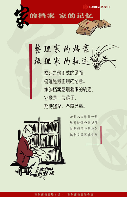 荆州市档案局(馆)、荆州市档案学会共同筹办了“档案——我们共同的记忆”档案展览,于2017年6月9日国际档案日在荆州城老南门广场举行。精心制作的16块展牌,以生动活泼的漫画风格和许多真实的原始档案,向人民群众普及档案知识,宣传档案工作和档案利用成效,引导和指导建立家庭档案。